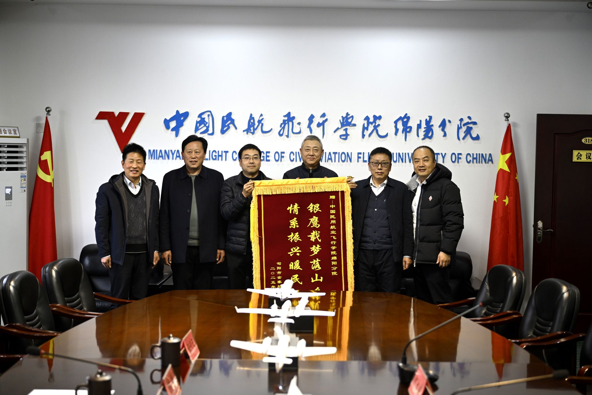 本网讯 张晗摄影报道:“银鹰载梦落山乡,情系振兴暖民心”。12月3日,民航陕西监管局三级调研员郭龙江、旬阳市金寨镇镇长李涛、张河村支部书记张代记、民航陕监局驻村第一书记张晓波一行,专程赴绵阳分院赠送锦旗并表达谢意,对分院倾情支援乡村教育、助力乡村振兴的公益之举致以崇高敬意。分院党委书记李学友、院长何永威、副院长宋川等会见郭龙江一行并接受锦旗。