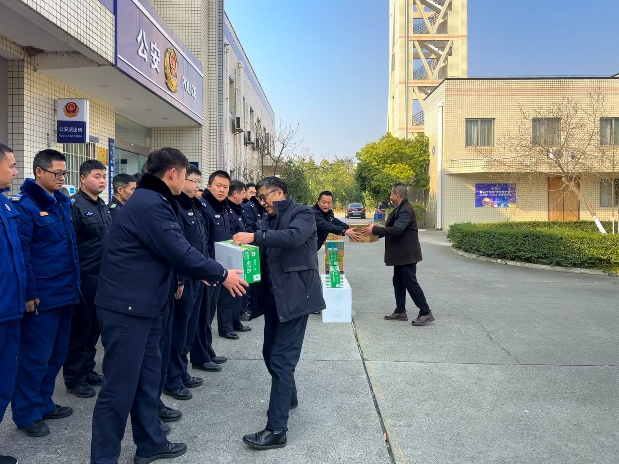 活动伊始,李书记代表分院党委对派出所为保障分院地面安全做出的成绩表示感谢,向辛勤奋战在一线的全体派出所同志及家属致以节日的诚挚问候和崇高敬意,并发放了牛奶等慰问品。随后,领导们移步派出所会议室进行座谈交流,派出所原所长王强深情回顾了派出所从成立之初到逐步发展的艰辛历程与重要变迁,通过一张张珍贵的历史照片,生动再现了过去峥嵘岁月里的奋斗身影与光辉瞬间。姚副院长对派出所全体人员提出殷切期望,强调要“高举一面旗帜,唱响一首警歌,铭记一段誓词,守护一方平安”的核心要求。活动最后环节,派出所全体人员集中观看视频《人民公安从这里走来》,学习公安英模的先进事迹,民辅警重温人民警察誓词。