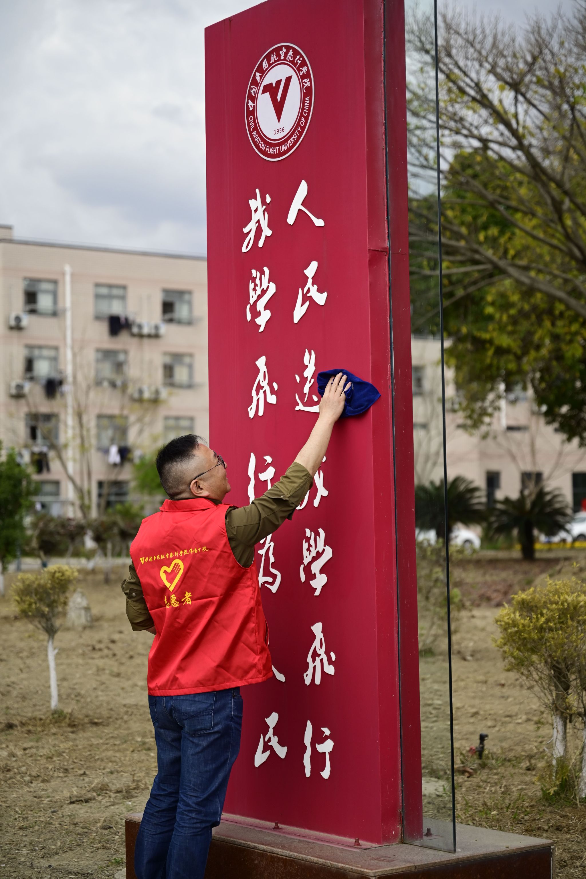 活动伊始,全体人员集中学习了中央、民航和学院关于开展树立和践行正确政绩观学习教育的相关文件精神和要求,对支部学习教育作出安排,对本次主题党日活动进行动员。随后,支部分发劳动工具,全体人员分为石刻描红组、文化小品清洁组,分工分区域开展劳动实践。对院区校训石、景观石等石刻开展描绘作业,对校园打卡点、宣传栏底座、校门前花坛立柱、国旗台等文化区域进行全面清洁。瞬间,“远举高飞 博学笃行”“九字经”“鹰击长空”等石刻文字重焕光彩,各文化小品焕然一新。