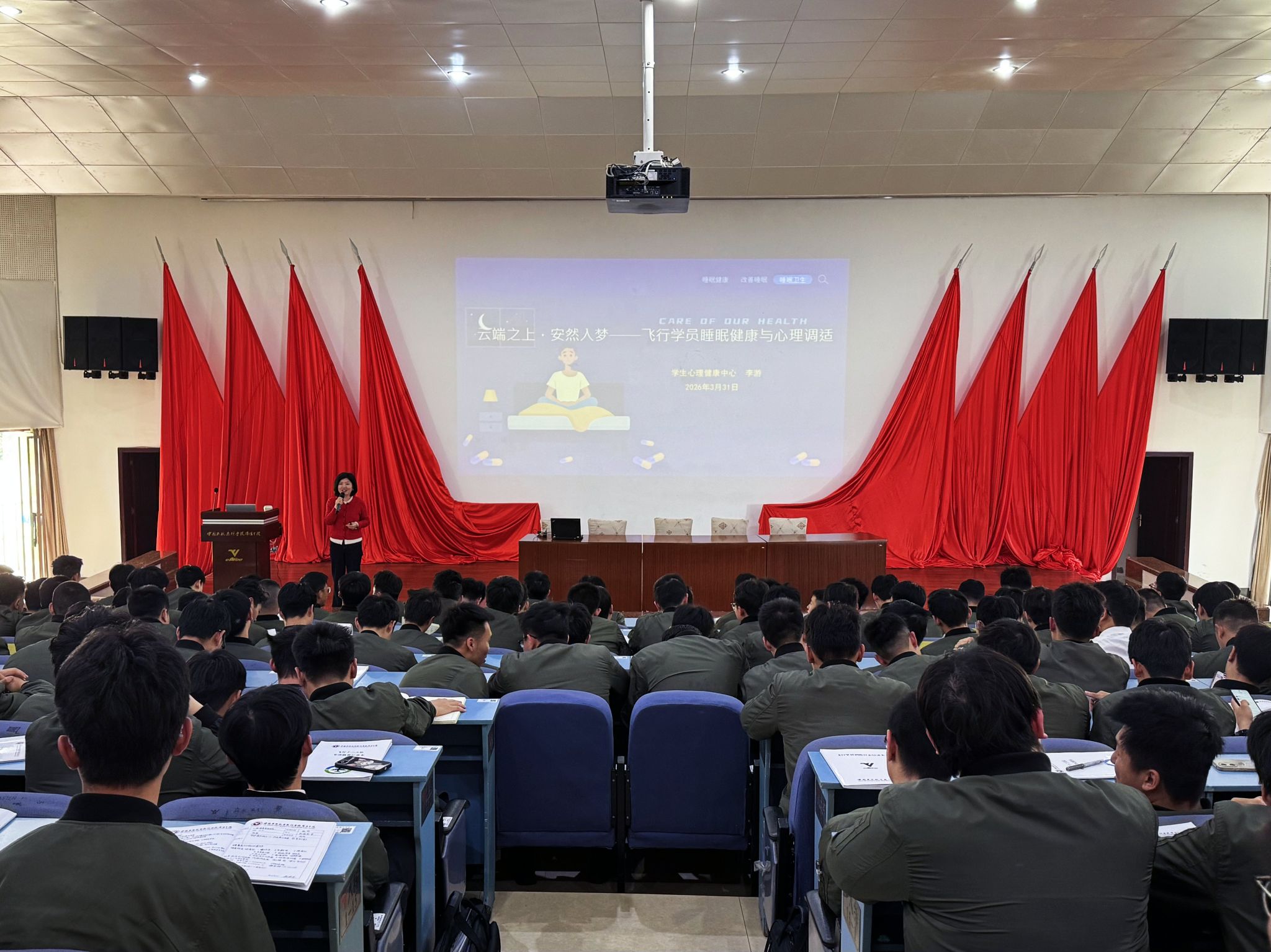 讲座中,李游老师结合飞行学生的专业特点与未来职业特性,帮助大家正确认识睡眠不足与压力积累之间的内在关联,通过理论讲解、案例分享和放松训练等方式,引导大家树立科学的心理健康观念,掌握实用的自我调节技巧。